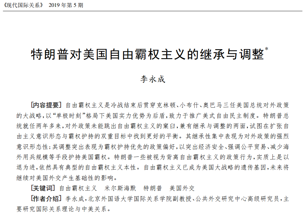 必赢76net线路官网李永成副教授在CSSCI期刊《现代国际关系》2019年第5期发表论文《特朗普对美国自由霸权主义的继承与调整》,论文摘要和原文链接如下: