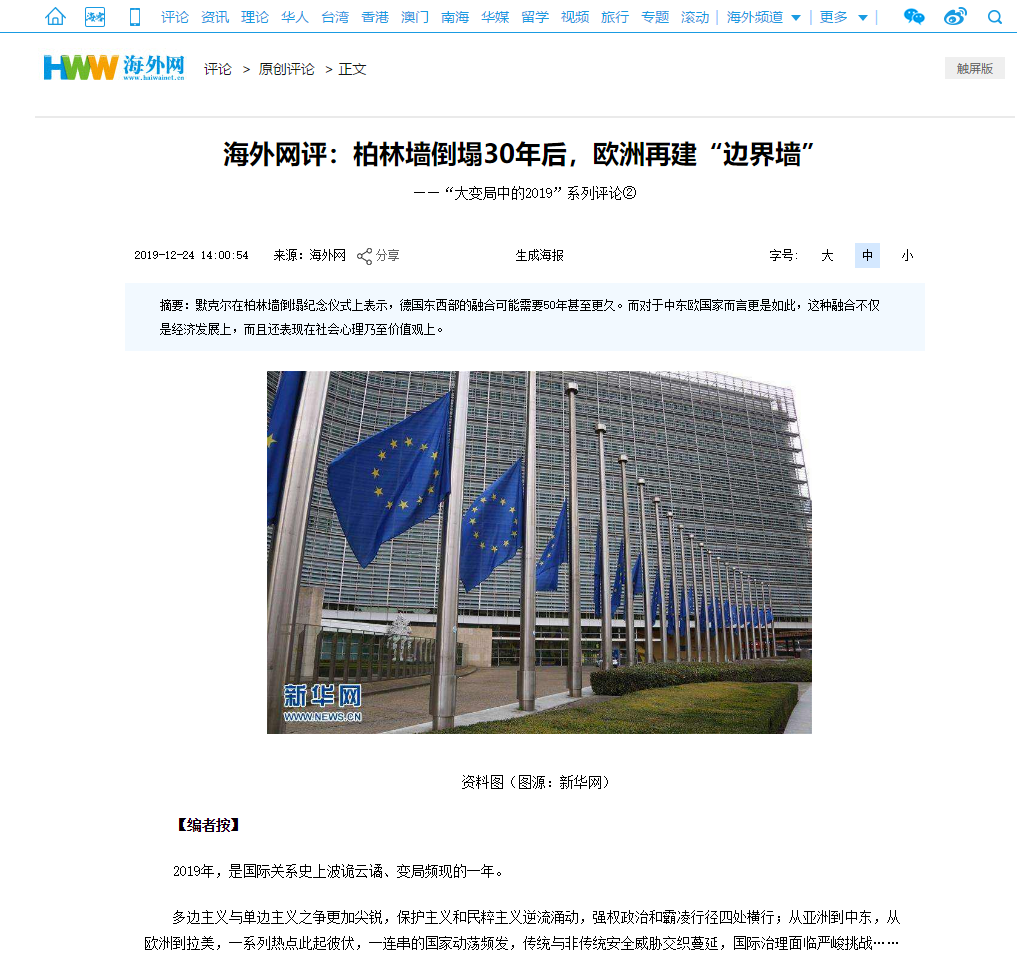 必赢76net线路官网王明进副院长作为海外网特约评论员发表文章,题目是《柏林墙倒塌30年后,欧洲再建“边界墙”》。该文是海外网推出的年终系列国际评论,“回望‘大变局中的2019’”的第2篇。海外网致力于打造中国在海内外具有重要影响力的新媒体国际传播平台,第一时间向读者提供中国热点、国际时政,特别是涉华国际新闻事件的权威解读。以下是文章题头截图、摘要和文章原文地址。
