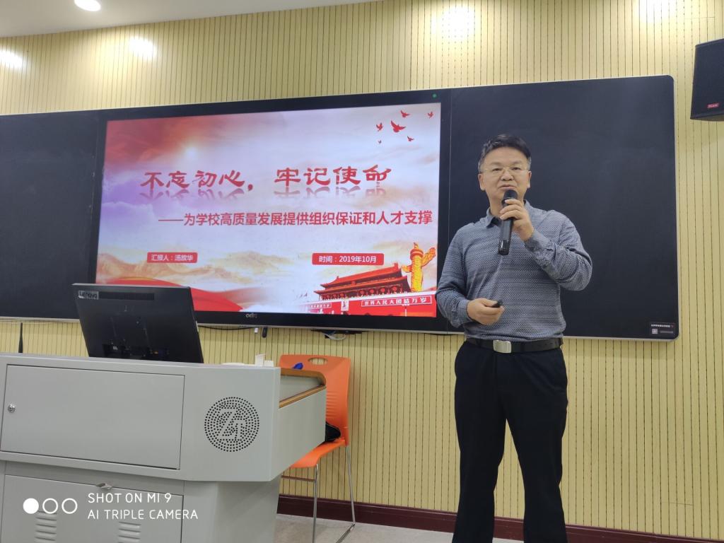 首先,汤书记给同志们详细讲解了“不忘初心、牢记使命”主题教育的重大意义和目标要求。他指出:“不忘初心、牢记使命”主题教育是用新时代中国特色社会主义思想武装全党的迫切需要,是推进新时代党的建设的迫切需要,是保持党同人民群众血肉联系的迫切需要,是实现党的十九大确定的目标任务的迫切需要。他要求我们切实践行守初心、担使命,找差距、抓落实。接着,汤书记阐释了自己在主题教育活动中的读书心得,并详述了自己在组织、人事等方面的工作体会。他认为高校立身之本在于立德树人,既要做好干部的培养、选拔、管理和使用工作,又要坚持党管人才。然后,汤书记讲到了近几年来学校发展取得的主要成效:树牢了干事创业的鲜明导向、畅通了能上能下的体制和机制、营造了风清气正的良好生态、推进了高层次人才队伍建设、建立了干事创业的人事考评激励机制,但还存在一些突出问题,需通过对标查找差距,及时整改落实。最后,汤书记指出学校将进一步加强和改进组织建设,强化人才支撑,建立爱国爱校敬业的人才队伍。