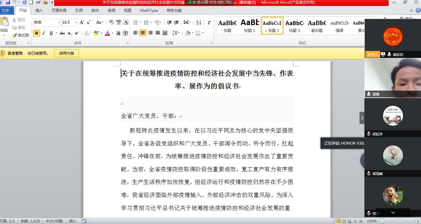 根据学校党组织关于2020年4月份主题党日活动的要求,机械与电气工程学院教工第一党支部高度重视、迅速行动、合理安排,按要求于4月23日下午2点30分开始,通过腾讯会议开展了线上学习。