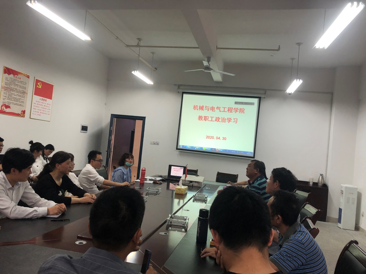 进一步贯彻传达beat365中国唯一官网四届五次教职工、工会会员代表大会成果和精神,2020年4月30日下午,机械与电气工程学院在会议室召开了全院教职工政治学习。由于疫情的影响,本次政治学习采取现场学习与线上会议相结合的形式举行,会议由党总支书记徐畅贤主持。