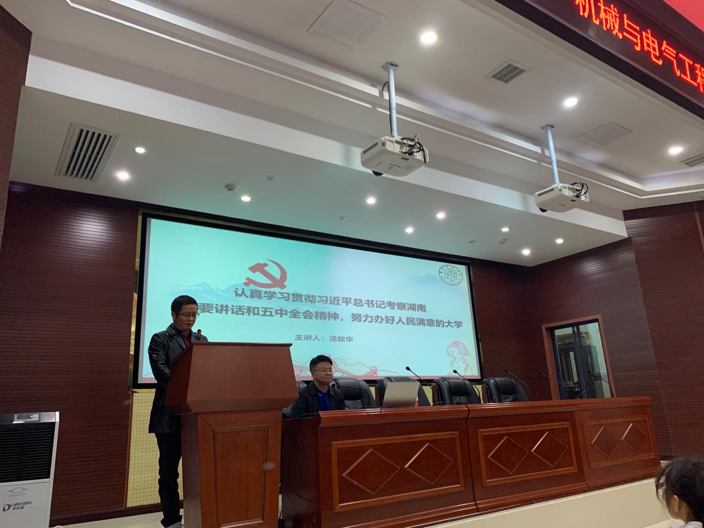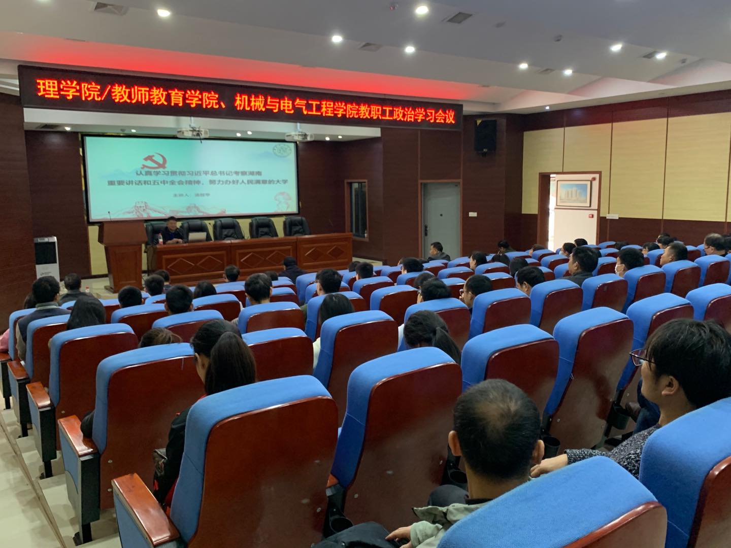 11月5日下午,机械与电气工程学院和理学院/教师教育学院在建规楼121报告厅举行教职工政治学习,专题学习习近平总书记考察湖南重要讲话和十九届五中全会精神,学校党委副书记汤放华做了题为《认真学习贯彻习近平总书记考察湖南重要讲话和五中全会精神,努力办好人民满意的大学》的宣讲报告,两个学院的全体教职工参加了此次政治学习。
