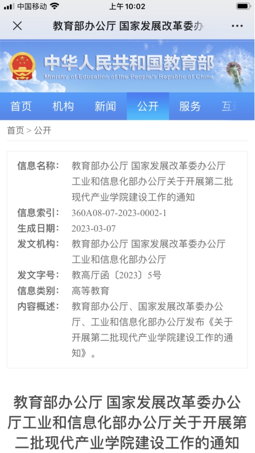 2023年3月7日,教育部办公厅、国家发展改革委办公厅、工业和信息化部办公厅发布《关于开展第二批现代产业学院建设工作的通知》,主要目标是以国家和区域产业发展急需为牵引,面向行业特色鲜明、与产业联系紧密的高校、重点是地方应用型高校,建设一批现代产业学院,融人才培养、科学研究、技术创新、企业服务、学生创业等功能于一体,造就大批产业需要的高素质应用型、复合型、创新型人才,为提高产业竞争力、汇聚发展新动能提供人才支持和智力支撑。