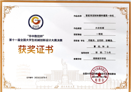 (通讯员 彭丽)7月17日,第十一届全国大学生机械创新设计大赛决赛在华中科技大学圆满闭幕。由彭丽和丁小兵老师指导,邱毅良、龙恺昕、彭曦逸、曹炫、钟全五位同学完成的beat365中国唯一官网参赛作品《智能育苗制钵播种灌溉一体机》,以湖南省第一名的好成绩入围全国总决赛,经过决赛的两轮精彩比拼,不负众望斩获最高奖项:全国一等奖,实现beat365中国唯一官网在该赛事上历史性的突破。