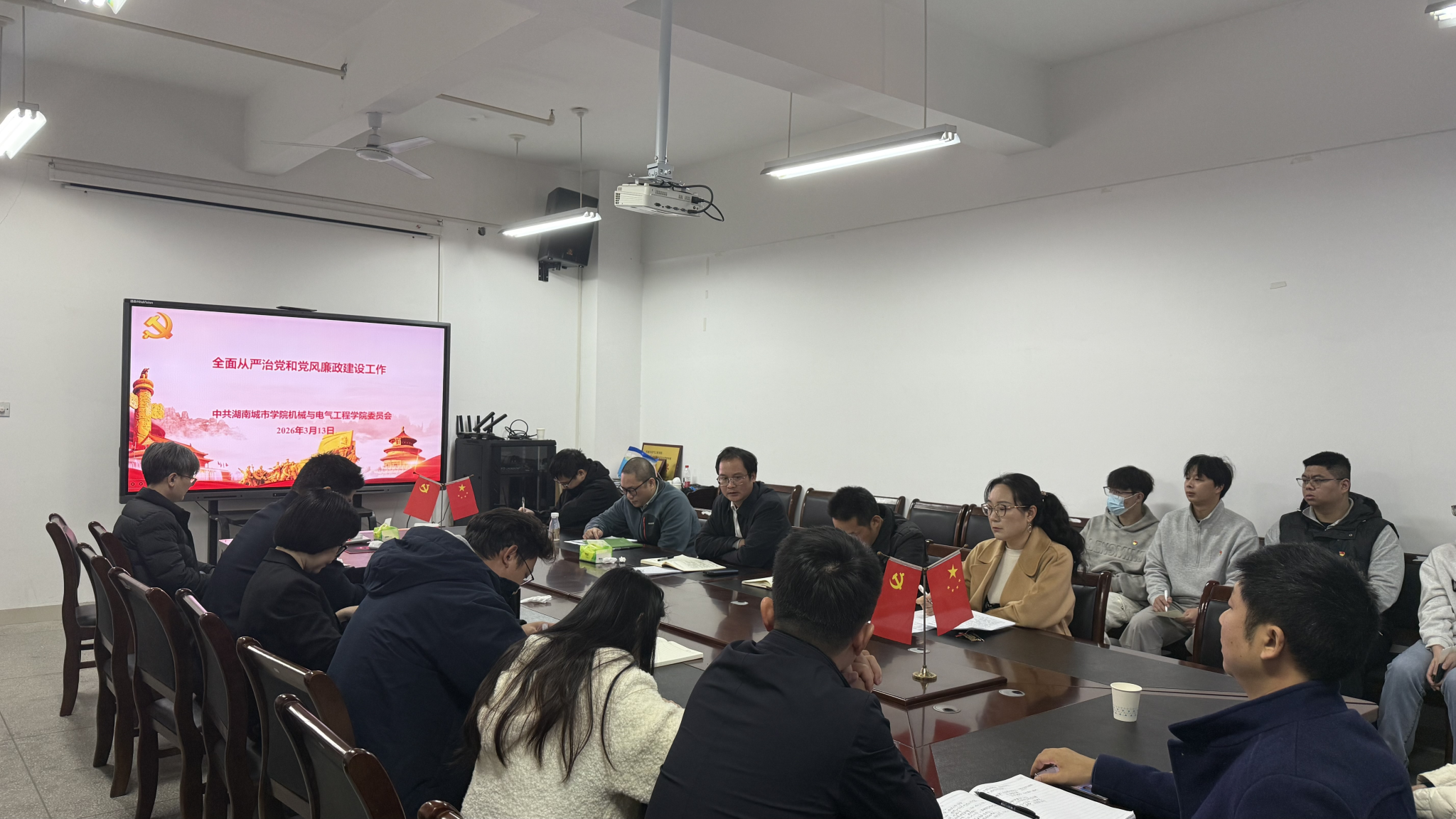 (通讯员:罗紫怡)3月13日上午,机械与电气工程学院党委召开2026年全面从严治党暨党风廉政建设专题会议。会议深入学习贯彻习近平新时代中国特色社会主义思想,全面落实新时代党的建设总要求和全面从严治党战略部署,进一步压紧压实管党治党政治责任,推动学院党风廉政建设和反腐败工作向纵深发展。学院党委副书记、院长张光富主持会议,学院党委班子成员、各支部委员、系(室)中心主任参加会议。
