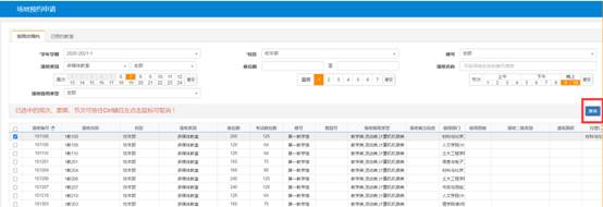 2、场地预约申请界面中,选择要借用的周次、星期、节次;点击查询,查询到可以借用的空教室。