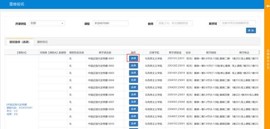 进入重修报名页面,如“跟班重修(选课)”界面中有教学班显示,请先在“跟班重修(选课)”中选择相应的教学班,点击选课,根据提示操作。