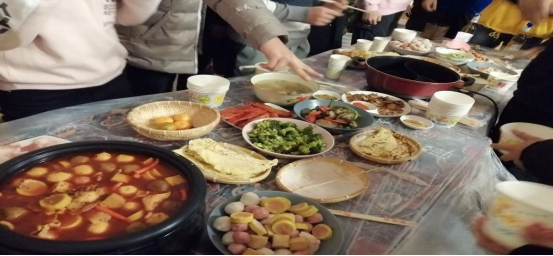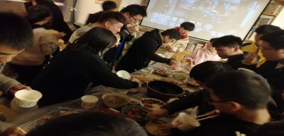 下午四时,筹备人员携带食材与道具到达现场开始布置场地,本是租借场地为两层小公寓,在布置好氛围道具后,由于天气原因,原计划的烧烤活动无奈取消。下午五时左右,全班同学统一乘坐包车到达了校外公寓,开始准备食材,并自由熟悉环境。下午六时十分,全班同学开始聚餐,屋内火锅热气腾腾。同学们有说有笑,其乐融融,好不快哉。虽疫情相隔数月,又课业繁忙,无几时可聚,自是同窗情谊深厚,素无间隙,不几何,与旧时无二,或更近几分。饮酣饭饱后,开始进行团体游戏,通过随机抽签分组,分成