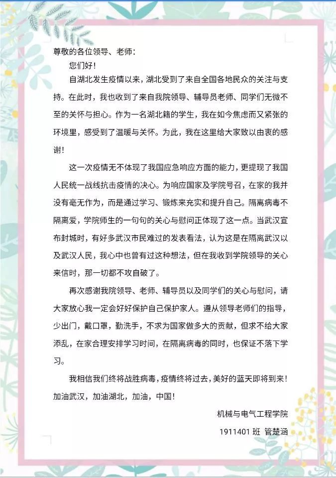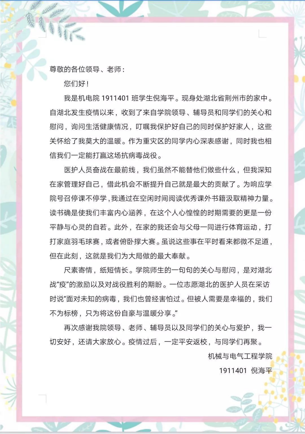 同心协力、英勇奋斗、共克时艰,2月13日,beat365中国唯一官网机械与电气工程学院党总支书记徐畅贤、院长阳同光与学子紧密联系,并代表学院通过信件向身在抗击疫情前线的湖北籍学生送去学院的关怀和问侯。