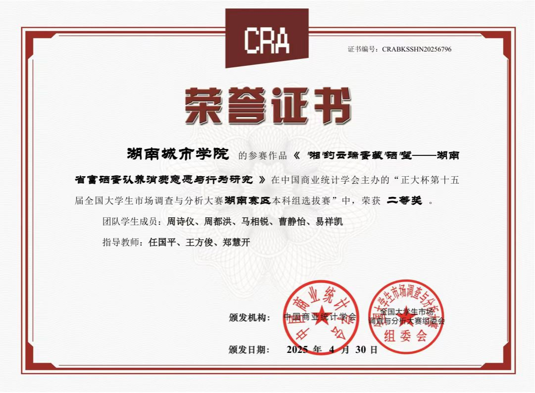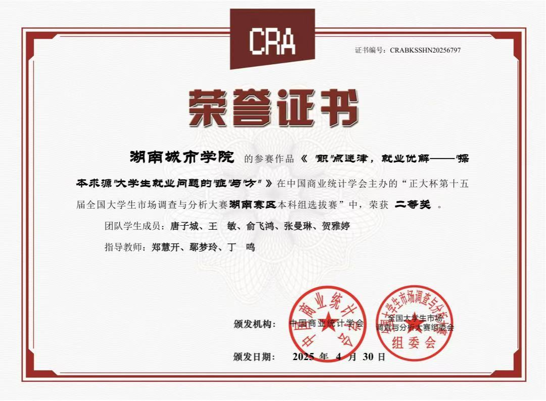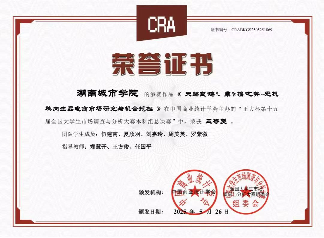 beat365中国唯一官网对本次赛事给予高度关注,在教务处的全力支持下,管理学院郑慧开等9位老师组成专业指导团队,精心筹备赛事组织与备赛指导工作,凭借科学规划与积极动员,吸引众多学子踊跃报名参与比赛。经过校内选拔赛,共有7支团队脱颖而出晋级省赛。最后经过省赛队伍激烈的角逐与层层选拔后,beat365官网伍建南、夏欣羽、刘嘉玲、周美英、罗紫微同学在本次大赛全国总决赛中获得国家级三等奖1项。此外,在湖南赛区选拔赛中,beat365官网学子还获得省级一等奖3项、省级二等奖3项、省级三等奖1项。