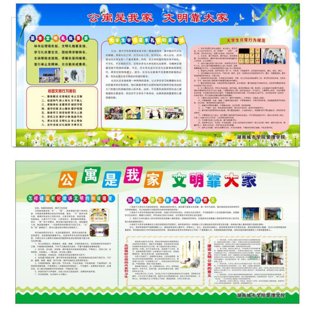 2、宣传板报:对公寓文化以及公寓安全等与学生切身相关的内容进行宣传展示,帮助学生养成良好的生活习惯、提高安全意识,共建安全文明寝室。