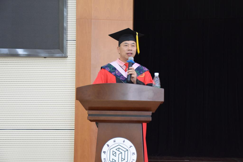 仪式第一项,由管理学院院长李教明上台致辞,他首先表达了对全体毕业生的祝贺,并对毕业生们所取得的成就进行了赞扬,他用充满诗意的语言教会毕业生们毕业不是终点,而是进入社会的起点。同时他教导毕业生们要不断努力完善自己,实现更高的人生目标。