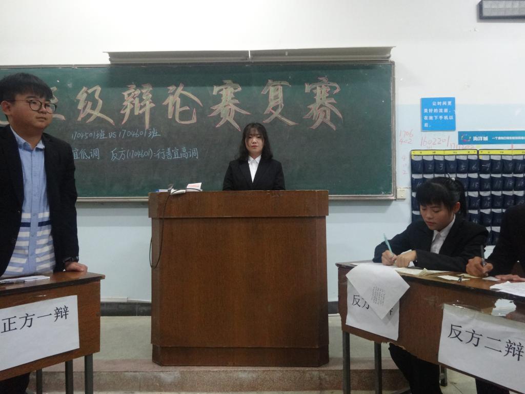 2017年10月27日晚7:00管理学院班级辩论赛复赛于1-204、1-206顺利开展。出席本次辩论赛复赛的评委有管理学院辅导员张力、分团委副书记张闪、学生会主席曾文烨、副主席邓圆圆、李志俊、晋雪莹、刘熠琛、郭子豪。