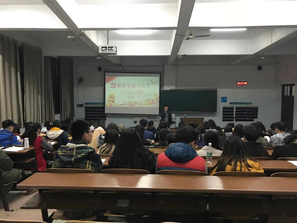李双清博士向学生介绍十九大的主要思想并阐述了十九大召开的重要意义;回顾从十八届一中全会到七中全会的重要建设成就,并就此引申出十九大所涉及的相关建设计划;重点为学生讲解习近平总书记在中国共产党第十九次全国代表大会上的报告,使学生对报告有了更加深刻的体会;最后,李双清博士号召学生树立不忘初心、永远跟党走的信念。