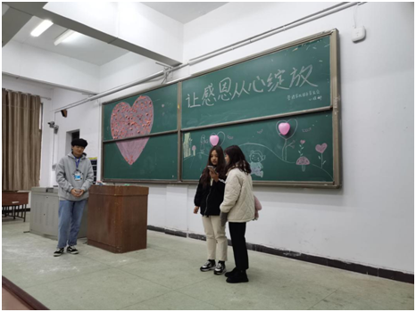 开场结束后,大家在主持人的组织下用便利贴写下自己心里想说的话,贴到黑板上的大爱心中;邀请参与同学到讲台上朗诵一些有关感恩的名人典故。以增强同学们对感恩的理解。