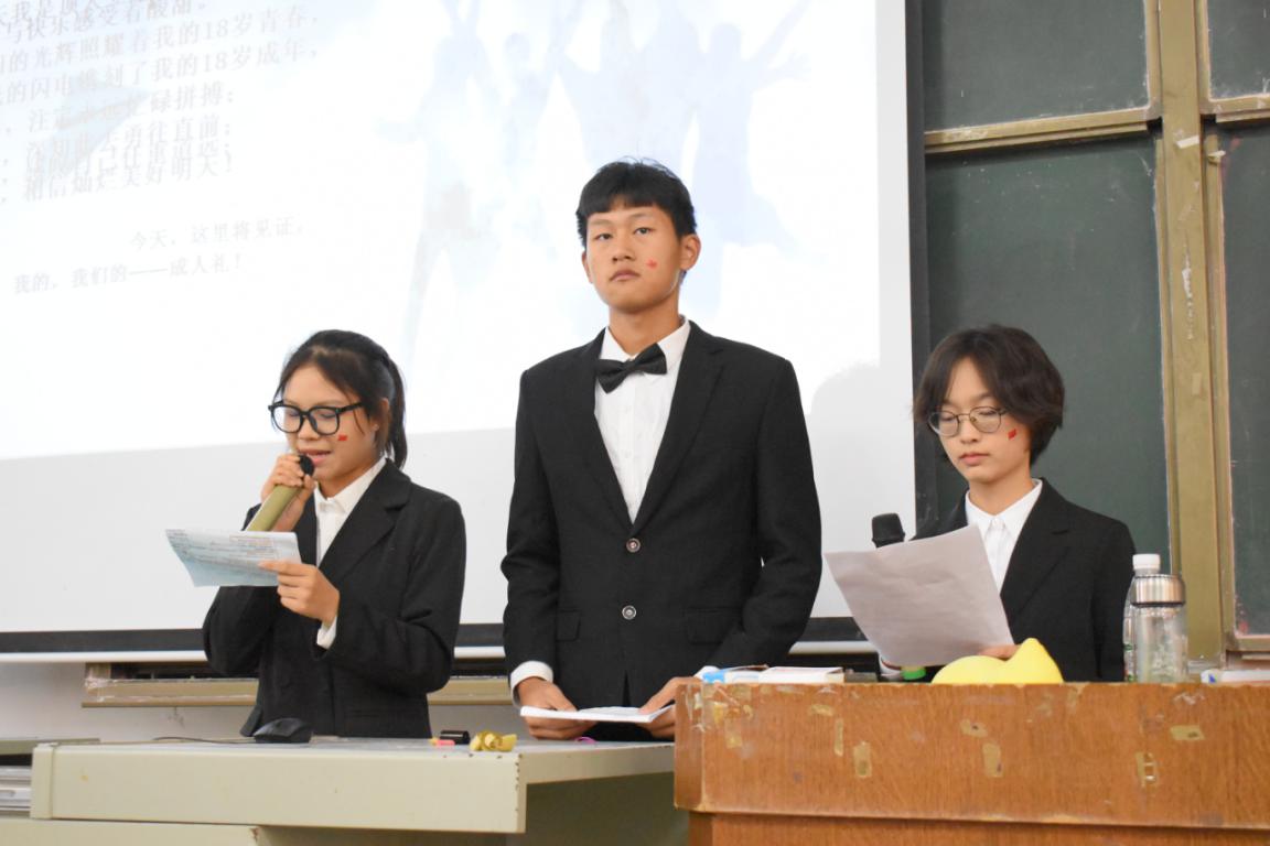 活动伊始,主持人介绍出席此次活动的嘉宾,并详细阐述了此次活动的目的。活动第二项,伴随着视频及图片,主持人带领大家回忆了童年往事,那些留在回忆里的童真童趣在所有人的脑海里渐渐浮现。活动第三项,管理学院才鑫瑞等新生代表进行演讲,分别讲述了他们自成年之后产生的新想法。活动第四项,主持人展示并介绍了古今中外成人礼的形式和意义,再一次强调今日活动的重要性。活动第五项,在场观众进行了“击鼓传花”的游戏,两轮接到“花”的志愿者分别上台讲述了自己成年后的感想以及对未来的期望,并与父母通话说一句“我爱你”。活动第六项,进入表演环节,各学院表演者分别展示了精心准备的歌舞节目。活动第七项,全体起立,宋玉强带领在场所有人员进行成人仪式宣誓。活动第八项,管理院、信电院、人文院所有青志成员合唱《年少有为》。活动最后,在场观众在此次活动的横幅上签下姓名并合影留念。