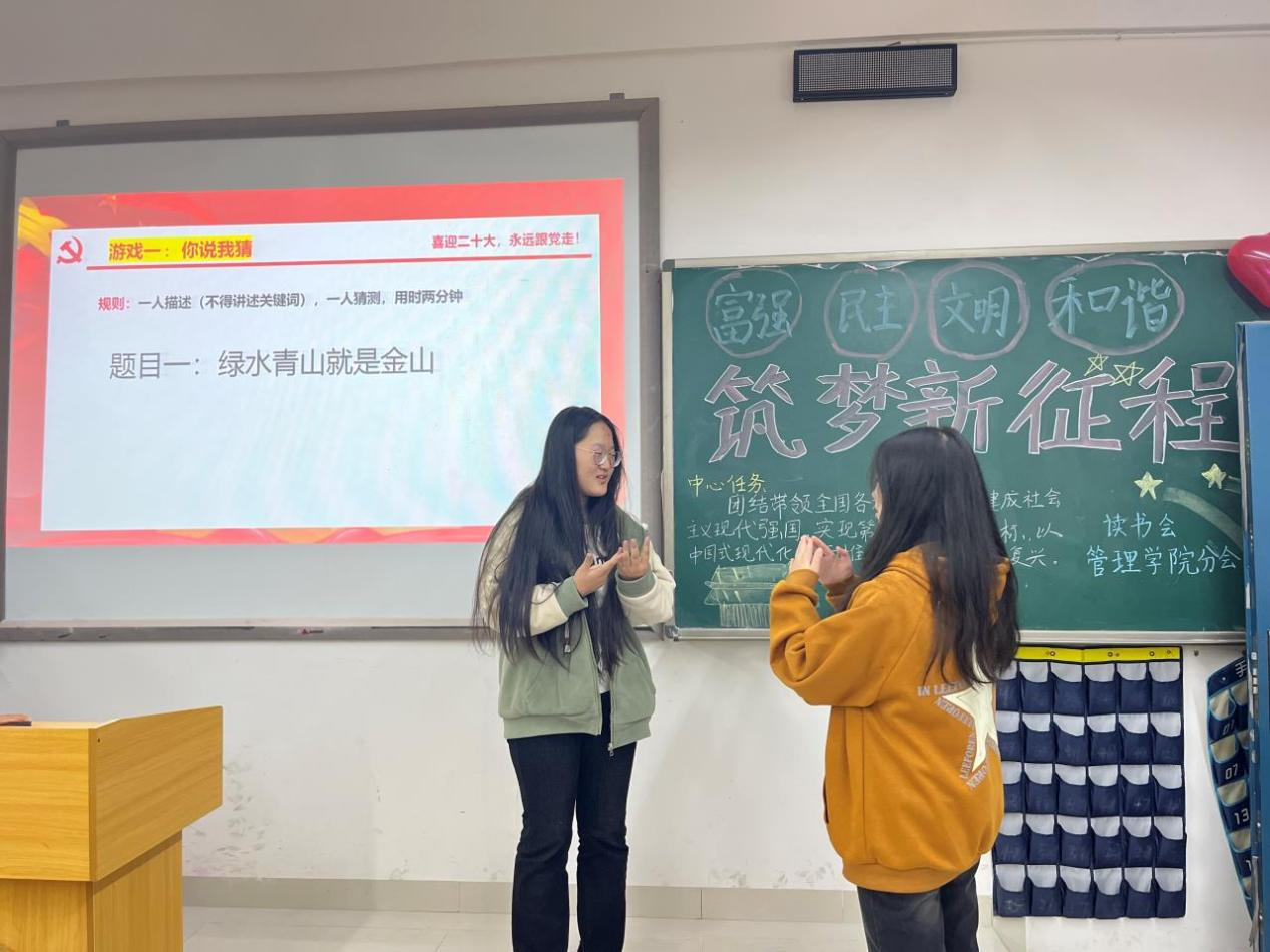 活动分为两大部分,一是介绍党的二十大及其意义。党的二十大报告从十六个方面总结概括了十年来的伟大变革,其中最具标志性意义的有六个方面:一是取得了“两个确立”的重大政治成果,二是中国共产党在革命性锻造中更加坚强有力,三是胜利实现全面建成小康社会目标,四是维护国家安全能力显著提高,五是我国国际地位显著提升,六是我国制度优势更加彰显。二是游戏环节,通过“你说我猜”“伟人事迹知多少”等游戏活跃现场气氛,参赛同学运用学习的历史文化知识,积极回答并踊跃发言。