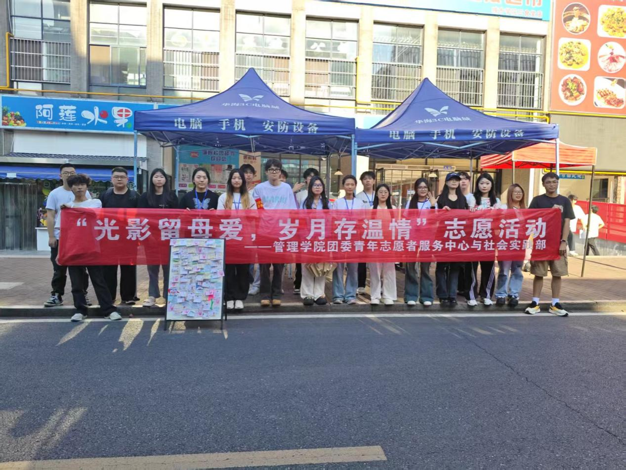 本网讯(通讯员 李钰 雷明浩)光韵勾描母影,岁痕蕴蓄情长。为弘扬孝亲美德,传承感恩文化,管理学院于2025年5月10日至2025年5月11日在新食堂西侧举办“光影留母爱,岁月存温情”主题活动。此次活动由管理学院团委青年志愿者服务中心与社会实践部组织,管理学院志愿者参与。