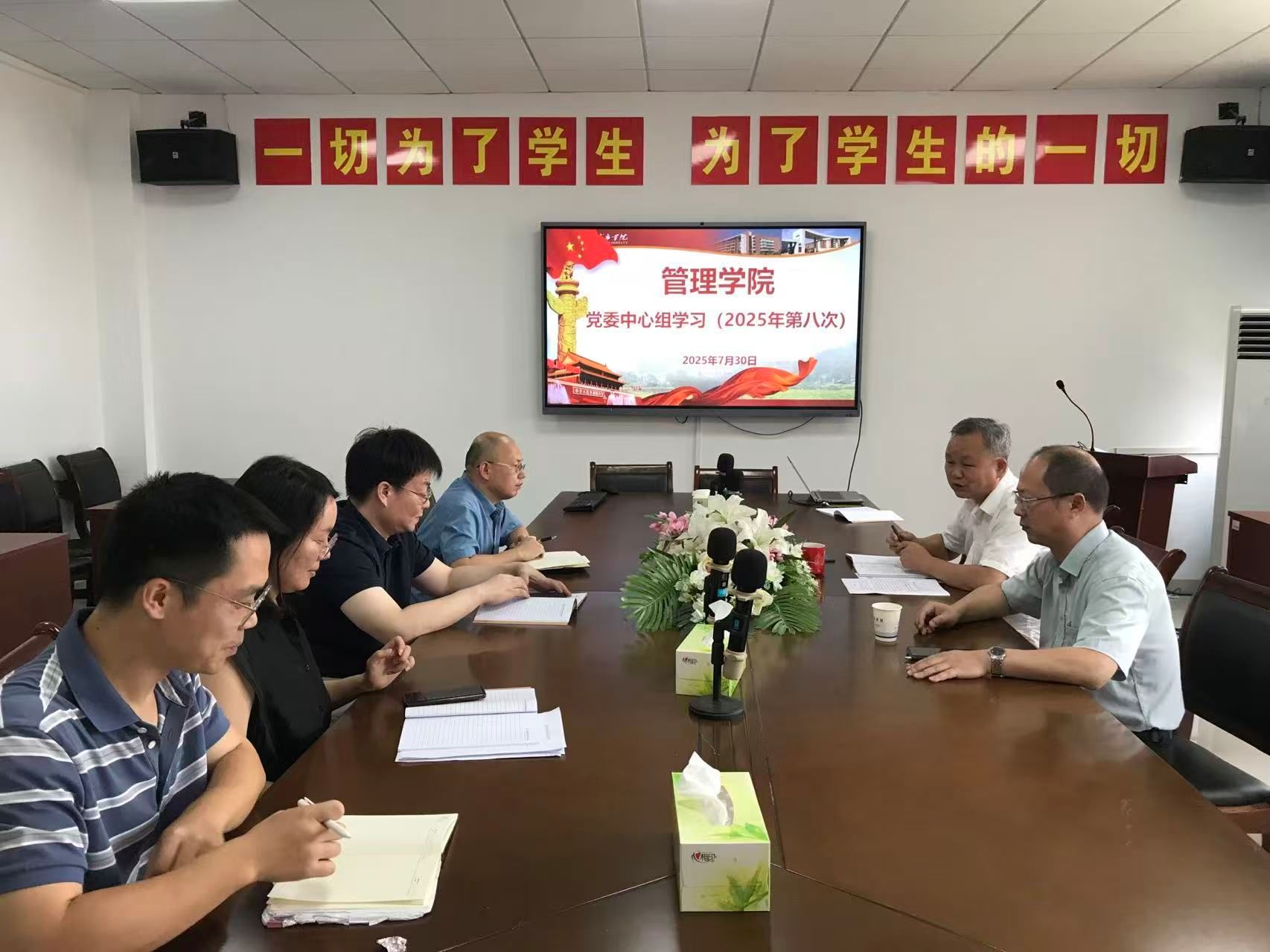 本网讯(通讯员:李姗)2025年7月30日上午,学院党委理论中心组在管理楼622开展了集中学习,学习由党委书记王正安主持,中心组成员参加了此次学习。