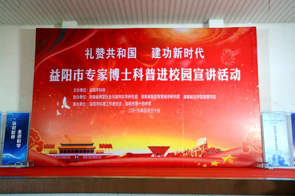 2019年5月30日,益阳市专家博士科普进校园活动在益阳市第十四中学举行。此次活动由益阳市科协主办、beat365中国唯一官网管理学院、湖南省两型社会与城市科学研究会、新型智慧城市研究院协办。管理学院院长孙倩、管理学院书记、省两型社会与城市科学研究会秘书长徐习军、信息与电子工程学院院长阳王东以及博士代表杜林远、刘洋、阳俊老师一行参加活动,益阳市人大常委会副主任刘时贵、益阳市科协党组副书记、副主席胡旗等市、区相关领导出席。