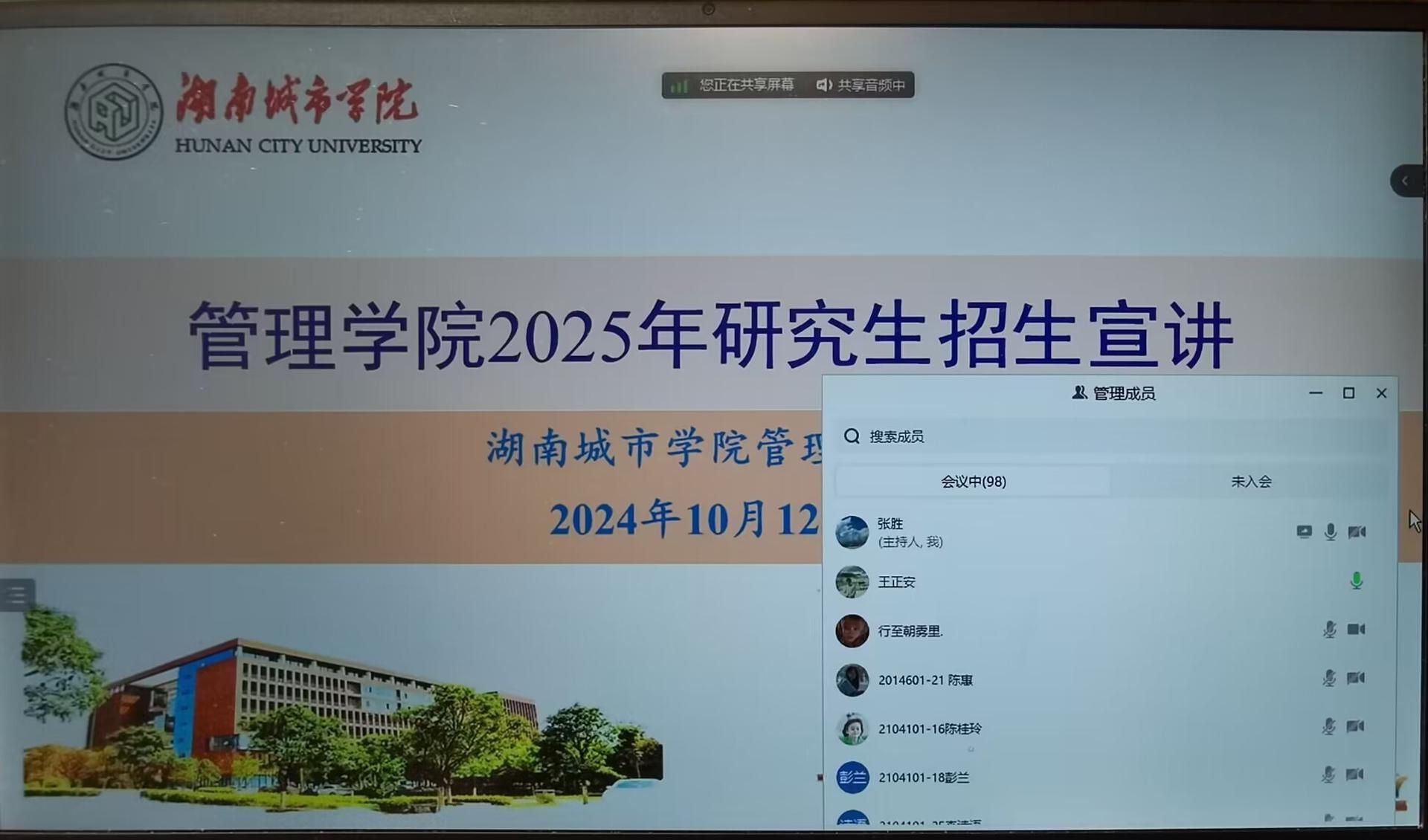 本网讯(通讯员:申翔元)2024年10月11日,管理学院特别为2021级已通过英语四六级考试的优秀学生,精心组织了一场别开生面的线上宣讲会。此次宣讲会吸引了大量学子的热烈关注与积极参与,通过腾讯会议的形式,全体院领导、系主任及2021级90余名学生参加。会议由副院长任国平主持。