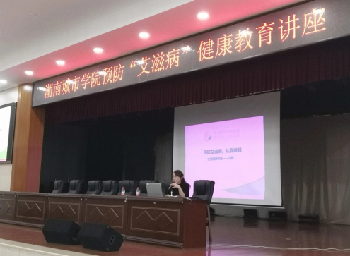 本次活动邀请益阳市妇幼保健院刘毅副主任医师作了“预防艾滋病,从我做起”的主题讲座。刘毅副主任医师从什么是艾滋病、艾滋病的危害、艾滋病的传染源、传播途径、易感人群、流行、防治及国家防控艾滋病的基本政策等方面深入浅出地进行了讲解,同时,她提倡大学生树立正确的人生观、价值观、爱情观,洁身自爱,拥有健康、快乐的大学生活,为防艾工程贡献出自己的一份力量。活动现场同学们反响热烈,互动效果良好。