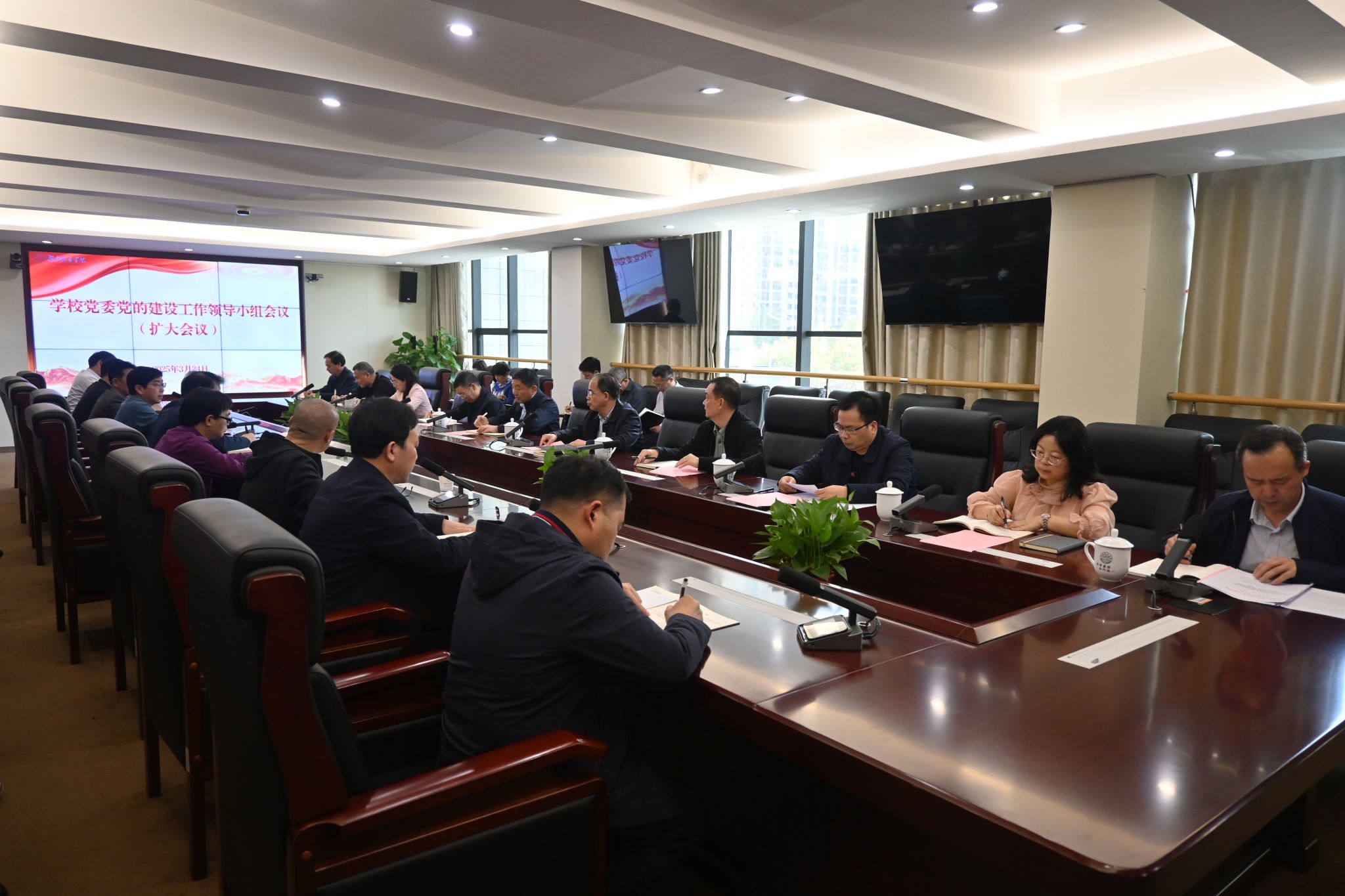 本网讯(通讯员 谢文静)3月24日,学校党委在办公楼一会议室召开党的建设工作领导小组会议(扩大会议),深入学习贯彻中央和省委党的建设工作领导小组会议精神,研究部署学校深入贯彻中央八项规定精神学习教育工作。校党委副书记、校长何振主持会议并讲话,全体校领导、各二级党组织书记及相关职能部门负责人参加会议。