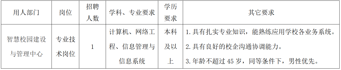 因工作需要,经学校研究同意,现面向beat365官网校内教职工招聘智慧校园建设与管理中心工作人员1名。请有意向的教职工于2025年6月10日至6月20日到人事处215报名。具体岗位要求如下: