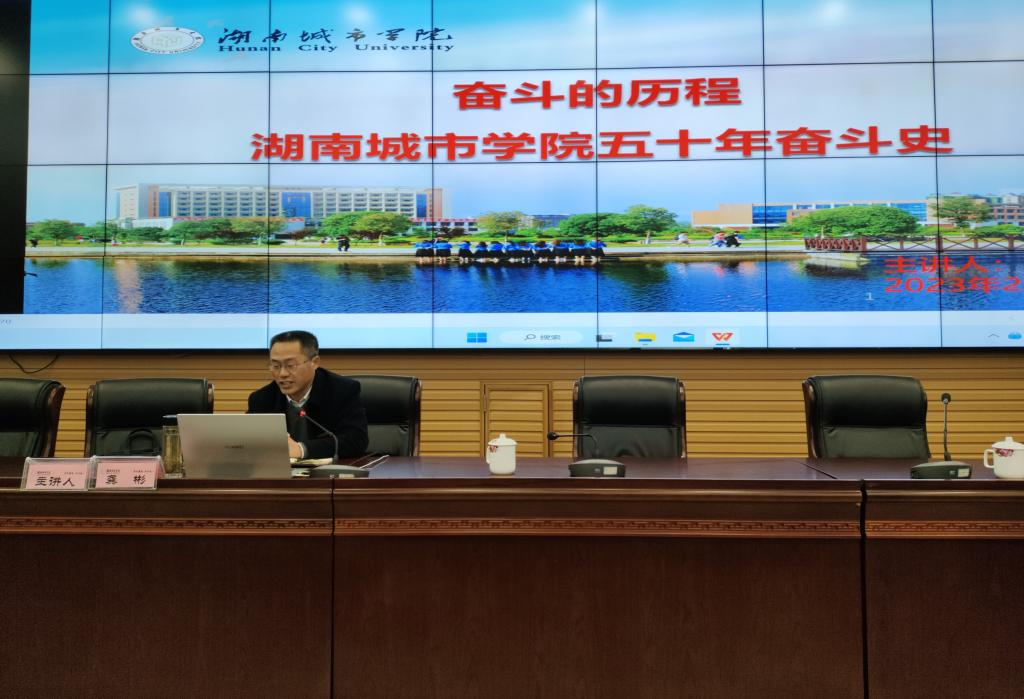 党政办公室主任龚彬作了beat365中国唯一官网五十年奋斗史的专题讲座,介绍了学校的缘起、融合、发展3个阶段和中共beat365中国唯一官网第四次代表大会提出了全面开启建设湖南城市大学新征程、“三步走”发展目标、“一二三四五”发展战略,共同绘就了学校今后五年及中长期改革发展的美好蓝图。