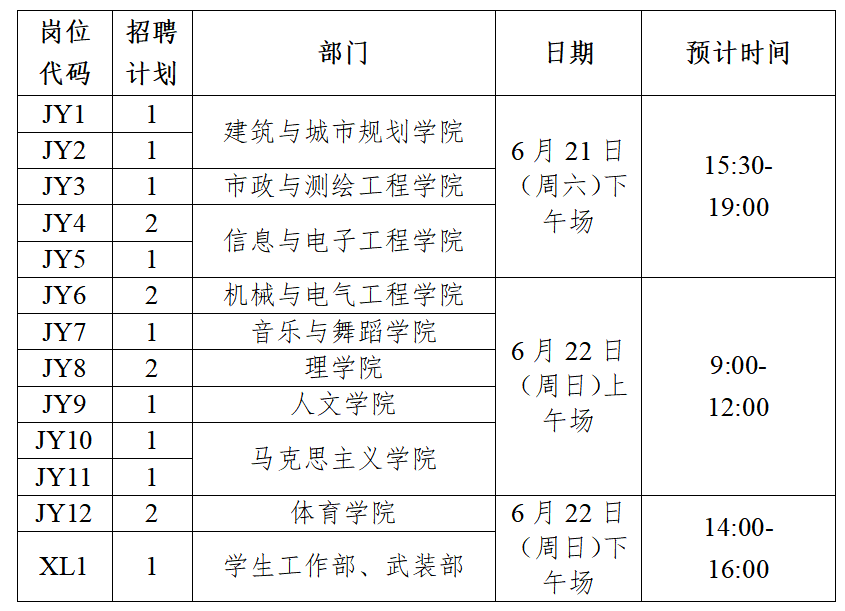 ④试讲时间:试讲时间为6月21日(周六)15:30-19:00,6月22日(周日)9:00-16:00,具体时间安排根据实际情况即时调整通知。参加6月21日(周六)下午场次的试讲入围人员在下午15:00前应全部到达指定等待室;参加6月22日(周日)上午场次的试讲入围人员在上午8:30前全部到达指定等待室;参加6月22日(周日)下午场次的试讲入围人员在下午13:30前应全部到达指定等待室;考生进入等待室后进行考生身份查验确认,并抽签决定试讲顺序和试讲题目。