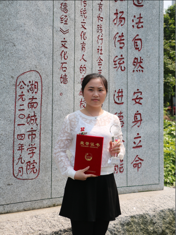2015年12月获beat365中国唯一官网“自强之星”荣誉称号;2015年11月获“书香城院”2015年阅读推广活动朗诵演讲比赛三等奖;2015年10月获“外研杯”全国英语写作大赛(湖南赛区)一等奖;2015年10月获2014-2015年度国家励志奖学金;2015年10月获2014-2015年度三好学生称号;2015年10月获2014-2015年度综合测评一等奖;2015年5月获2014-2015年度优秀共青团员;2014年12月获大学生培育和践行社会主义核心价值观微视频竞赛活动二等奖;2014年12月获2013-2014年度优秀心协会员;2014年5月获2013-2014年度优秀团员。