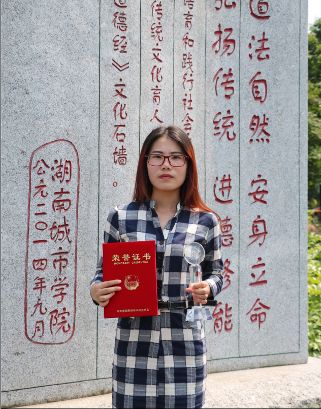 2013-2014学年荣获国家励志奖学金; 2014-2015学年荣获国家励志奖学金;2013-2014学年荣获“三好学生”称号;2014-2015学年荣获“三好学生”称号;2013-2014学年荣获“德、智、体、美综合测评二等奖”;2014-2015学年荣获“德、智、体、美综合测评一等奖”;2014-2015学年荣获“优秀共青团干”称号。