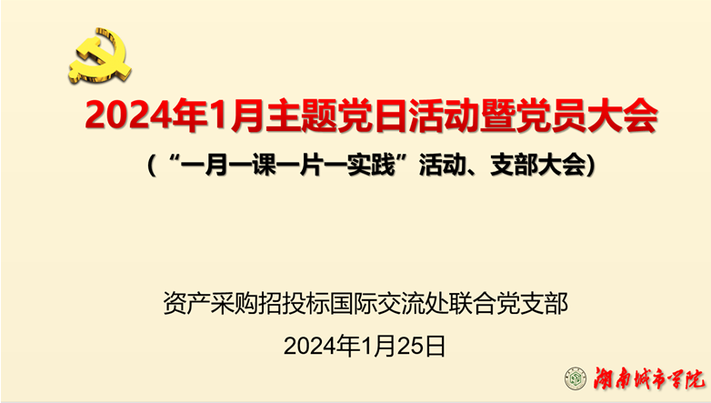 2024125日下午,资产采购招投标与国际交流处联合党支部在一办131支部党员活动室举行主题党日活动并召开支部党员大会。支部全体党员7人均到会,会议由支部书记肖爱民主持。